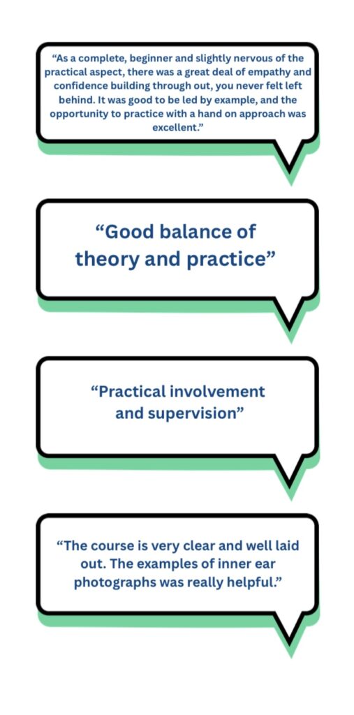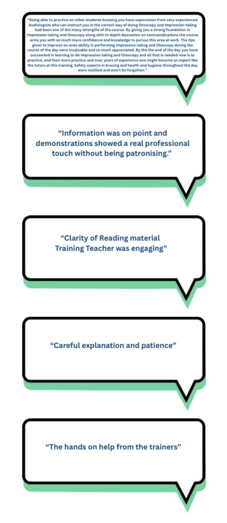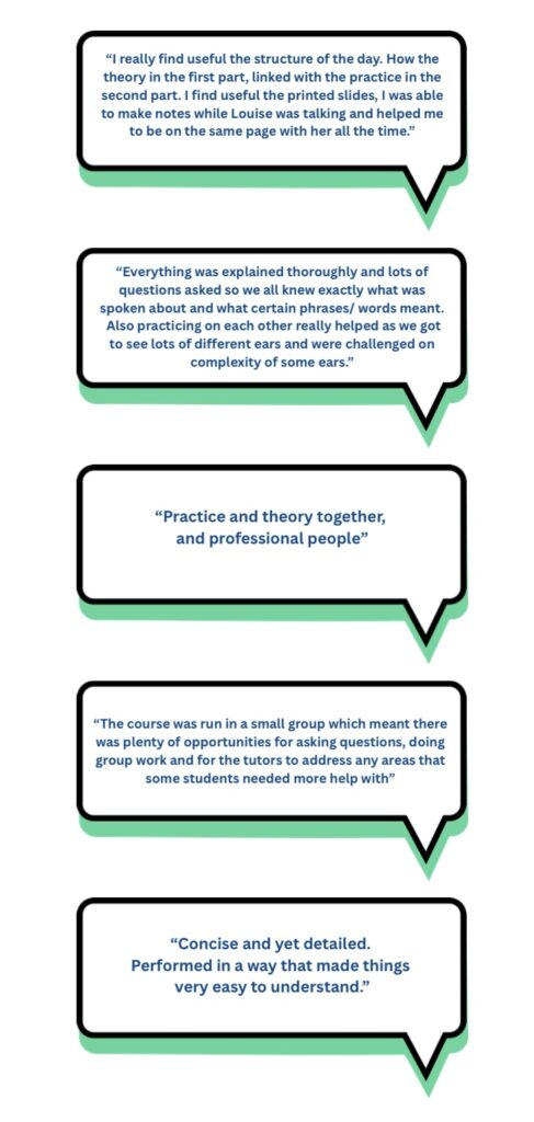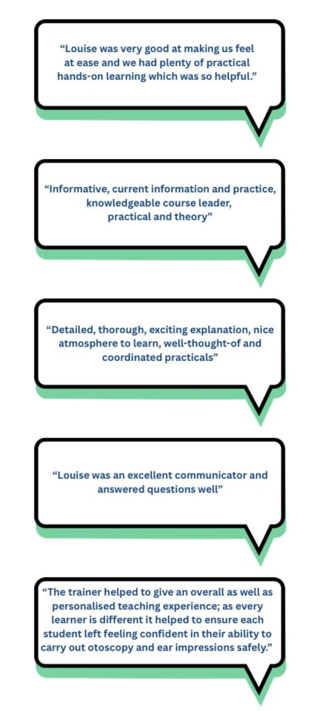 “I had a great time training with Louise on the Otoscopy and Impression Taking course. So much so that I am currently booking my next course. Louise is an excellent trainer and takes time to ensure that each course member makes their way through the coursework in a timely manner and answers all questions thoroughly and allows individuals an appropriate amount of learning time. This has not only added to my skill set but has improved my knowledge and professional development. Thank you Louise.”