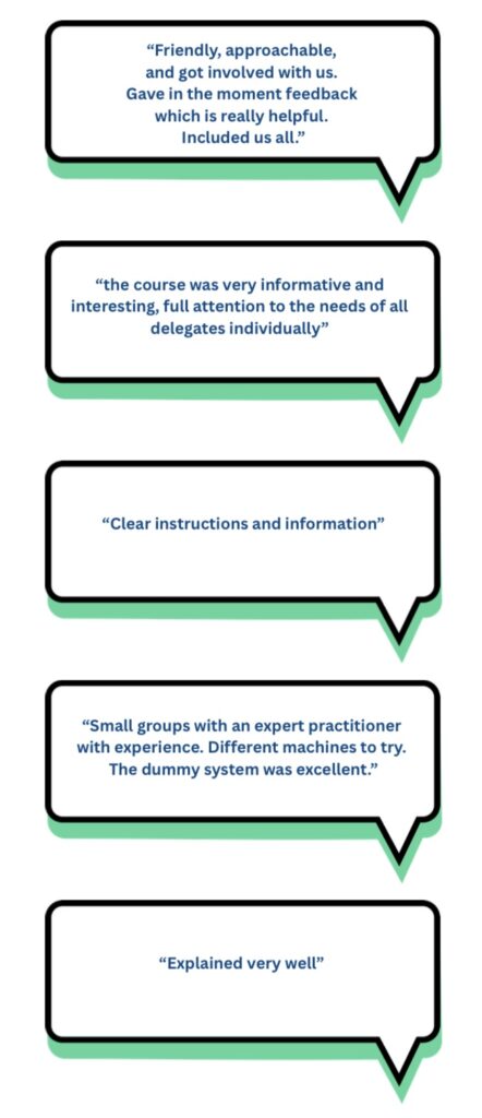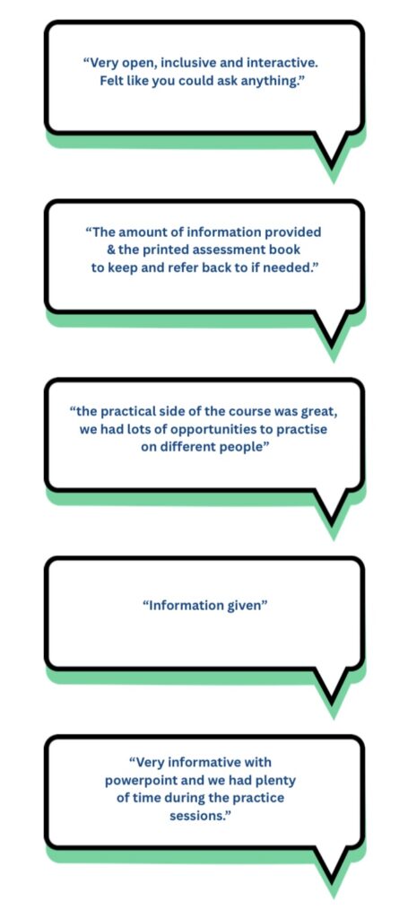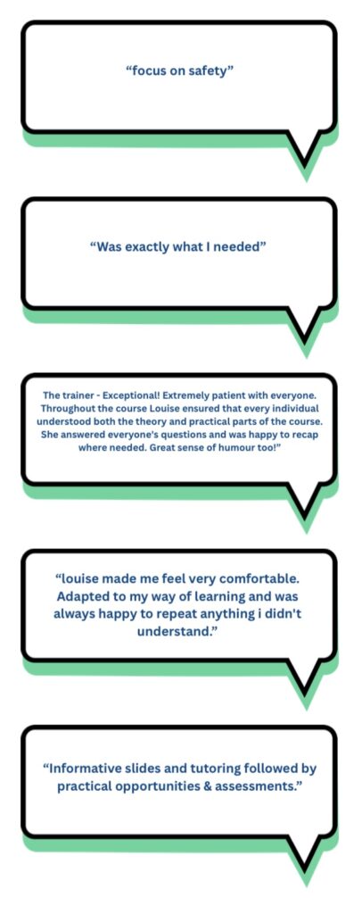 “Louise was extremely knowledgeable & imparted it very well. Training centre was excellent & with parking very close. Communications were extremely prompt when booking the course & after.”